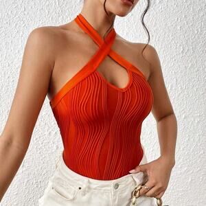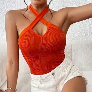 Crisscross Tie Backless Halter Bodysuit - Orange - 8/10