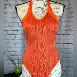 A stunning halter bodysuit in burnt orange.