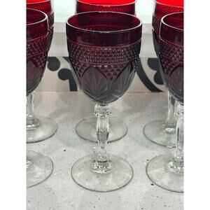 Add a touch of vintage elegance to your table with this set of six Cristal D'Arques Durand ruby red wine/water goblets. These stunning glasses stand approximately 8 inches tall and feature a beautiful, rich red color that will enhance any dining experience.