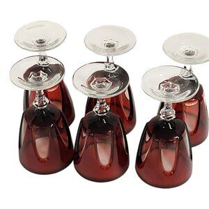 Elegant set of six Cristal D'Arques-Durand Gothic wine glasses, featuring a deep ruby red bowl and intricately cut clear glass stem for a refined look. These vintage glasses are crafted in France, known for their high-quality lead-free crystal. The Gothic design adds a bold, sophisticated contour to any glassware collection. Please note one glass has a small chip, as highlighted in the provided images. These glasses are ideal for serving wine or as collectors’ items. Dimensions: Approx. 6 inches tall and 3 inches in diameter.