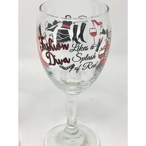 Fun set of 3 wineglasses! All girls themed. One each that says: Fashion Diva Likes a Splash of Red, Girls Are Fabulous, and Girls Love Shoes & Wine.