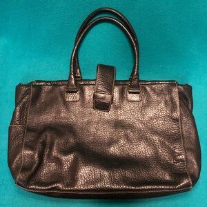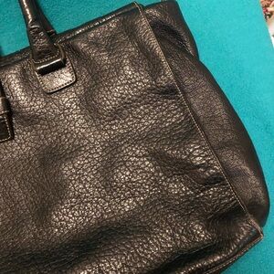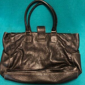 Generously sized shoulder bag. Pebbled leather. Black w white top stitching. Top has fold-over flaps, faux tuck look strap with magnetic closure. Two outside pockets on sides. Internal zip pocket, one drop-in pocket.