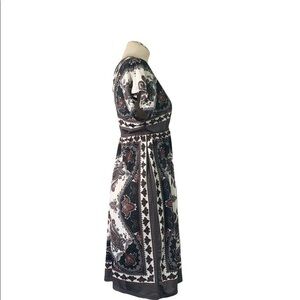 Boho style symmetrical print stretch sheath dress with v-neck. Midi length. Short sleeves. Grey, black & red graphic print on white.