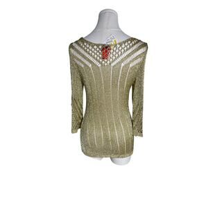 Stunning metallic gold knit sweater by Cristina, new with tags. Features an open-stitch neckline and 3/4 sleeves with a semi-sheer ribbed body. Style SM5932G.