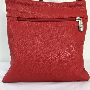 Cristina in Pell Red pebble Leather Adjustable Crossbody Purse EXCELLENT Condition, front zipper pocket, silver toned metal logo on front, back zipper pocket, center zipper pocket, monogram interior lining, two interior slip pocket, interior zipper pocket, made in Italy, genuine pebble leather, classic, casual, everyday purse, 9"x 8", silver toned hardware, adjustable crossbody strap