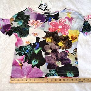 Cristinaeffe Women's Floral Lilac Short Sleeve Stretch Top Blouse Sz 42/6 Italy