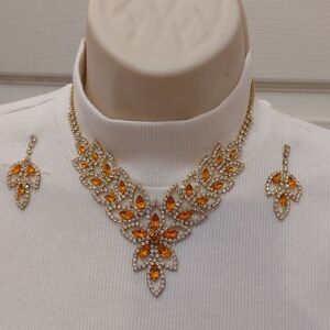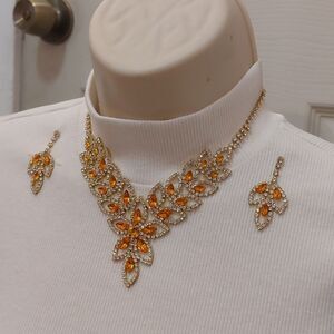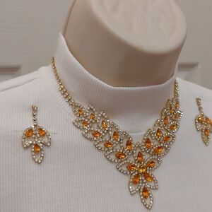Cristina's Collection Orange Rhinestone Dramatic Bib Necklace Dangling Earrings