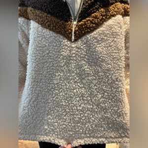 This sweater pullover is very cozy with a retro chevron brown print across it. It also has pockets on the sides for a bonus!