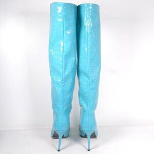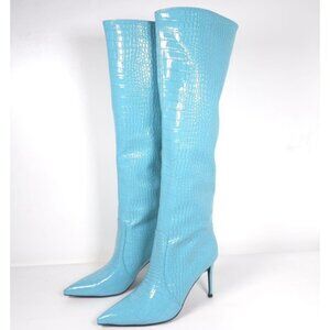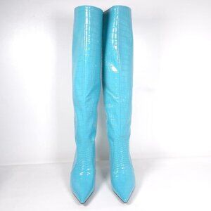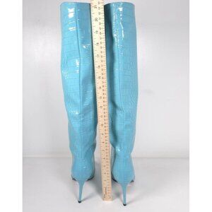 Croc Detail Pointed Toe Stiletto Heel Knee High Boots Size 40 Blue Faux Patent