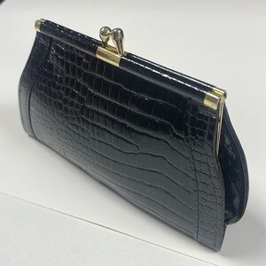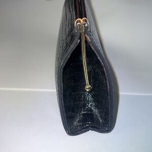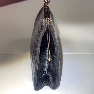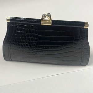 This is a lovely Croc Embossed Black Leather Kiss-lock Clutch Wallet. Excellent condition. No issues. Dark red leather interior. Goldtone hardware. 7” x 3.75 x 1”