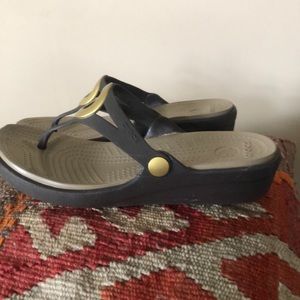 Gently used, brown croc flips, gold color ring on top. A slight wedge heel which feels great.