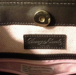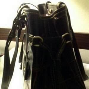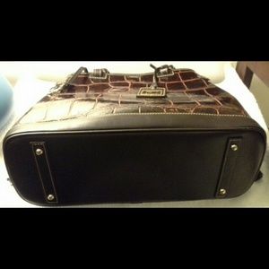 Beautiful chocolate croco handbag with zippered, and cell phone pocket, side key chain. Includes dust bag.