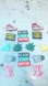 Set of assorted designer-themed shoe charms. Includes red, black, green, and yellow colors.