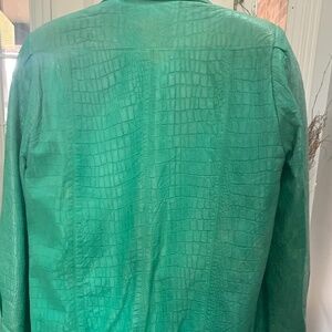 Christian Lauren luxurious crocodile- embossed 100% lambskin emerald green leather pencil silhouette slit skirt and longer length fully lined jacket. Comes with green leopard print cotton mock turtle neck sweater and gold lizard brooch. Jacket is a size medium, lined with front side pockets. Jacket length is 29” long. The skirt is high waisted with inner lining, back zipper with clasp closure, and a high slit at the back. The waist is 26” hips 37”. Skirt length is 33” long.