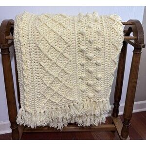 Crochet Afghan Throw Blanket Yellow 3D Nolan Aran Diamond Bobble Fringe Handmade