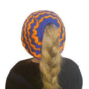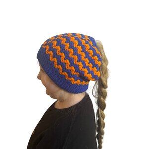 This crochet ponytail beanie features vibrant blue and orange stripes in a soft, breathable knit. Designed with functionality and style, its unique pattern includes an opening for accommodating ponytails or braids. Perfect for cold weather, this hat offers both warmth and versatility, combining handmade charm with practicality.