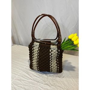 Brown and white crochet bag with plastic tortoiseshell handles. In gorgeous condition, quite deep and holds a considerable amount of stuff.
