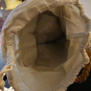 Has an off white linen fabric lining with a drawstring at the top for additional privacy/ security for your personal items.