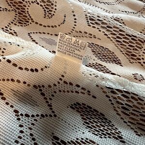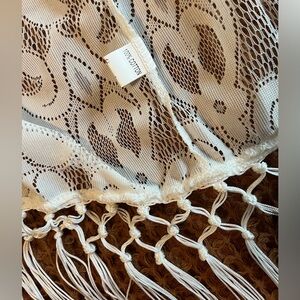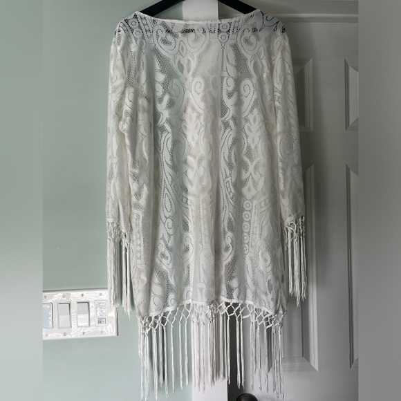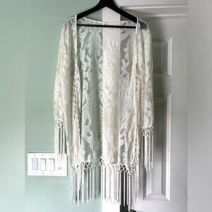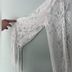 White Lace Crochet Sweater | Beach Coverup | Fringe Hem & Sleeves | Large & Flowy | Light & Delicate | Slight Discoloration on sleeve barely noticeable