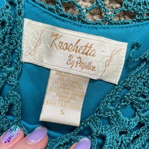 This dress is super pretty and is handmade! The neckline on the right side is a little stretched out. Size S but stretches a lot.