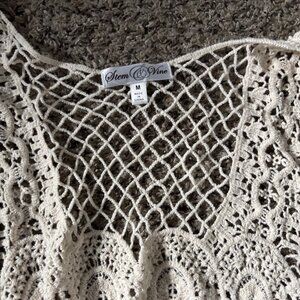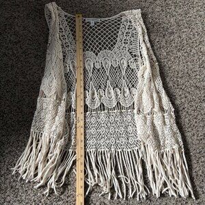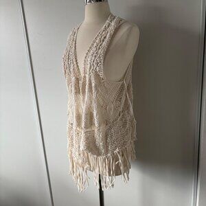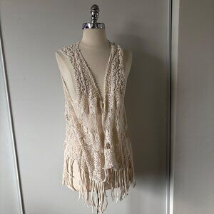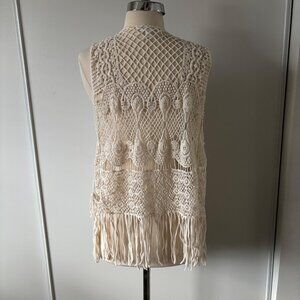 Crochet Fringe Open Vest Womens Sleeveless Boho Style Medium Cream Stem & Vine