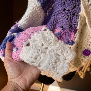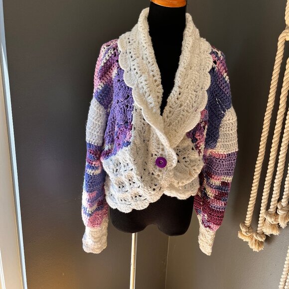 Unique cardigan sweater hand crocheted in purple and white with a foldover shawn collar and front button. Hits at the waist. Sizing is a M/L.