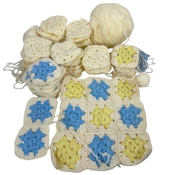 Crochet Granny Square Lot 60+ Squares In Yellow/Blue Crafting Or Blanket Making