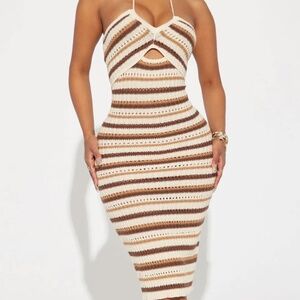 Bring effortless vacation vibes with this stunning crochet-knit midi dress. Featuring neutral cream and caramel stripes, it blends boho charm with a curve-hugging silhouette that flatters every shape.