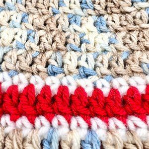 Design: Red and white stripes alternating with blue, brown and white variegated yarn