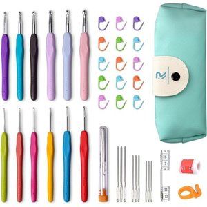 🧿【44pcs Crochet Hooks Set】This ergonomic crochet hook set including 12pcs multicolor rubber handle hooks, sizes from B(2mm) to N(8mm). 20pcs Stitch Markers, 9pcs Large-Eye Blunt Needles, 1pcs row counter, 1pcs ring cutter, 1pcs measuring Tape, meet your different demands in crocheting.