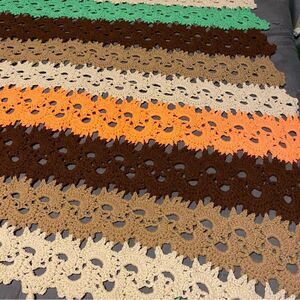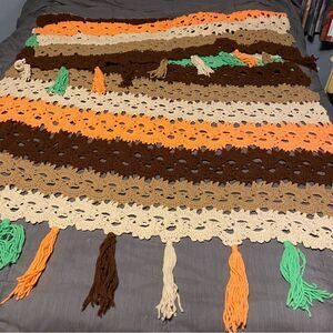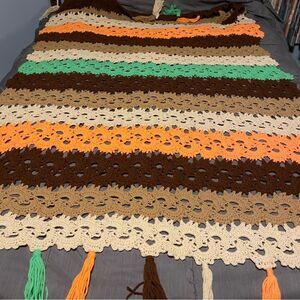 Crochet Knit Afghan Blanket Throw Tassel Handmade Orange Tan 70's Retro funky 90