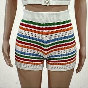 These playful yet sexy crochet knitted shorts are the perfect addition to your summer wardrobe. Made from 100% polyester, the lightweight, breathable knit fabric ensures comfort on even the hottest days. The shorts feature a colorful striped print, with eye-catching hollow-out and eyelet details that add texture and visual appeal. The high-waisted design with an elastic waistband offers a slim, flattering fit, hugging your curves in all the right places for a sexy, confident look.