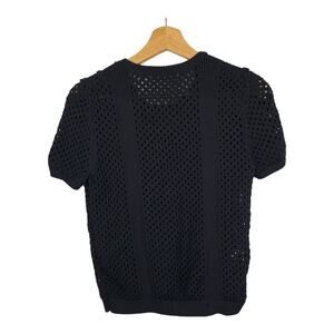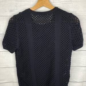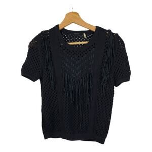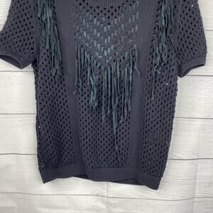 Crochet Leather Fringe Black Short Sleeve Open Knit Sweater Gothic Size Small