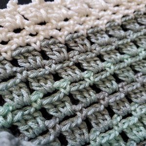 I crocheted this pale mint and gray baby blanket/afghan and it is made with an ombre yarn giving it it's unique look. It measures approximately 30 inches by 30 inches making it a great size for a newborn or to travel with or to keep in the bassinet or crib. The pale mint color is a light green that fades into a gray.