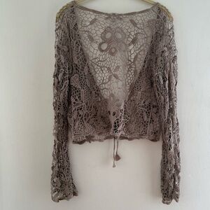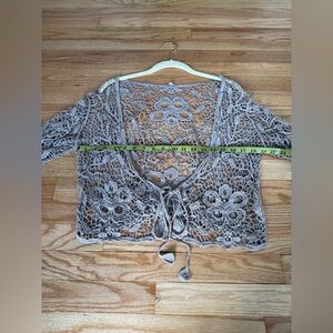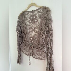 Really pretty, boho all season cardi. No brand tag, measuring a small. The neutral mauve color and crochet style makes this a great layering piece.