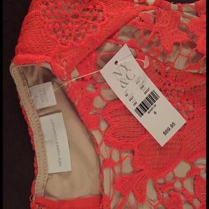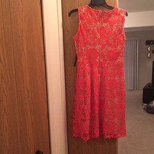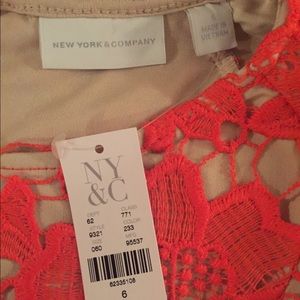 NWT. New York and Co. Nude Midi Dress with Orange Crochet Overlay. Size 6. Perfect Condition. Back Zip.