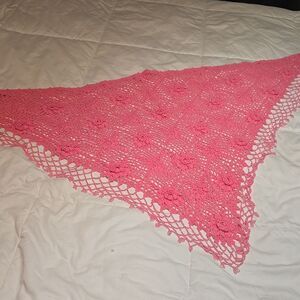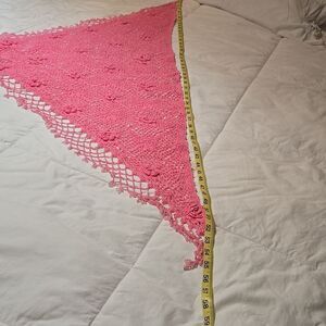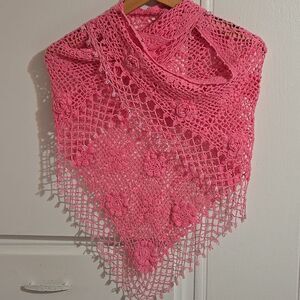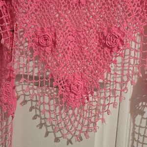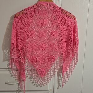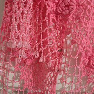 I found this beautiful crochet shawl/wrap pink color with some beautiful shiny colors at the ends it does not have a brand so I'm not sure if it was handmade or if it was made by a company but it is gorgeous there is no stains and it's not damaged at all I have inspected every single corner of these beautiful shaw it looks to me like a medium size but the measurements