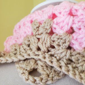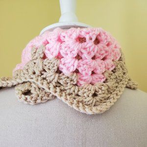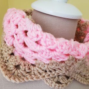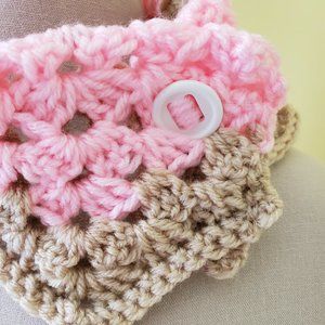 This neck warmer is totally adjustable so you can wear it as loose or as tight as you wish; just put the button through any whole in the neck warmer. The pink and brown will look great with any jacket or outfit.