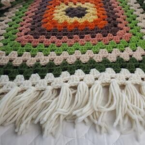 This Crochet Poncho Shawl is a unique and handmade piece perfect for a casual occasion. Made from yarn and acrylic materials, this vintage-inspired sweater features a boho hippie design with bright colors and fringe accents. The open-knit construction and sleeveless shawl style make it ideal for the winter, fall, and spring seasons. Its one size fits all and is easy to care for with machine washable instructions. This granny square sweater cape exudes a hipster, granny core, hippie, bohemian, and cottagecore vibe, adding a touch of character to any outfit.