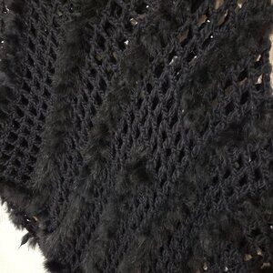 Crochet Poncho with Genuine Rabbit Fur Trim & Fringe Black