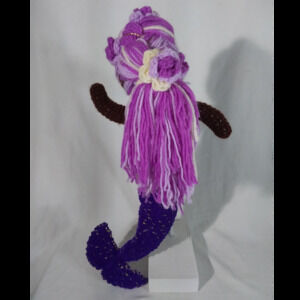 Large mermaid with ruffly top and choker. A large purple and white french braid with flowers a hair-do.