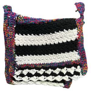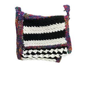 Crochet Purse Hand Made Multicolor Black And White Flap Closure Long Strap