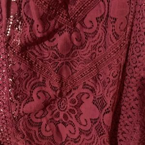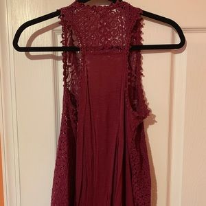 Maroon crochet racer back top. Front is a pretty crochet pattern. The top or the back is a crochet pattern as well and the bodice of the back is more or a T-shirt material