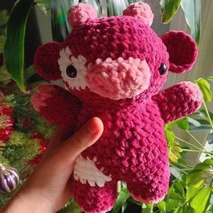The plushie is 9 inches wide (arm to arm) and about 10 inches tall. The plushie is handmade from Premier Yarns, Parfait Chunky yarn. 100% Polyester, super soft.