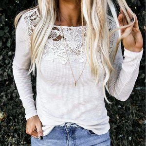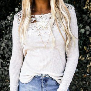 The perfect top to pair with your favorite denim for a casual, effortless look. A must-have ribbed top with trending lace detail at the bust. Delicate and casual, we love this top. Super cute with a fall vest!