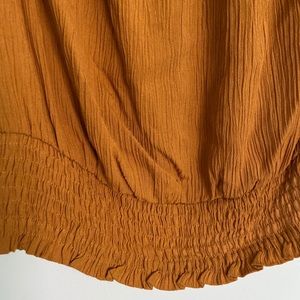 Floral crochet ruffle off the shoulder top featuring a smocked waist. 100% Rayon. Color: Mustard.