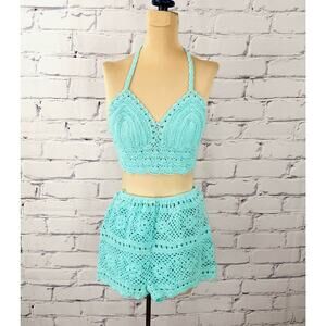Crochet Set Shorts Halter Cardigan Womens S Teal Green Summer Beachy Tropical