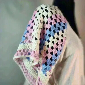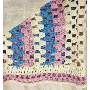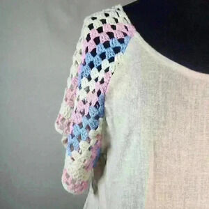 This cute loose-fitting top features crochet sleeves in a pink, blue and cream stripe mix with a pink/cream border.