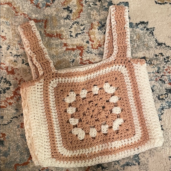 Stylish crochet tank top with a square pattern. Features cream and tan colors. Handmade granny square crop top