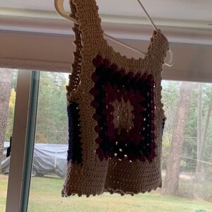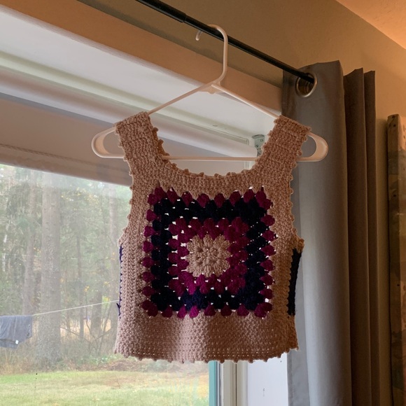 Stylish crochet tank/crop top with a vibrant square pattern. Features shades of purple, pink, and cream. Super cute and comfortable! No tags on item but I think it’s made from polyester. I love this too but I just have too many similar items! It fits size small/medium